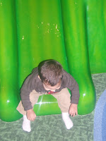 Last night JJ and I took the boys to see Santa. We figured since it was pouring down rain outside there would not be a big crowd. We met up with Josh at the store and my friend Sarah and we headed down to Santa's area. As soon as we got there one of the "elves" told us Santa needed a potty break. Yes those were her words not mine, and she told us to wait about 10 minutes. So we headed over to the indoor playground to wait for Santa. The boys had fun running around and playing, while I kept an eye out for Santa's return. About 8 minutes later we get the boys ready in their strollers and head over to wait in line (we were first.) Another 8 minutes and Santa is still not back, at this point JJ comments that Santa may have some intestinal problems, I think we can all agree to that what with all those cookies and milk in his bowl full of jelly. Anyways back to my story... it was taking so long that Josh had to go back to work and then of course 2 minutes later Santa comes back from the "potty." We head up the red carpet and they both look at him like he is an alien and do not want to sit in his lap. Finally Jacob crawls up there and Caden just digs his nails in deeper into my skin. He was TERRIFIED!!! And so I had to sit on Santa's lap just to get the picture. Poor little guy would barely smile unless I tickled his leg. Maybe next year will be more successful.
